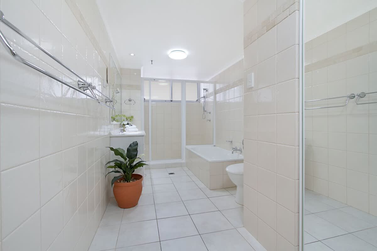 Guest bathroom with separate shower and bath, plus a separate laundry with top-loading washing machine