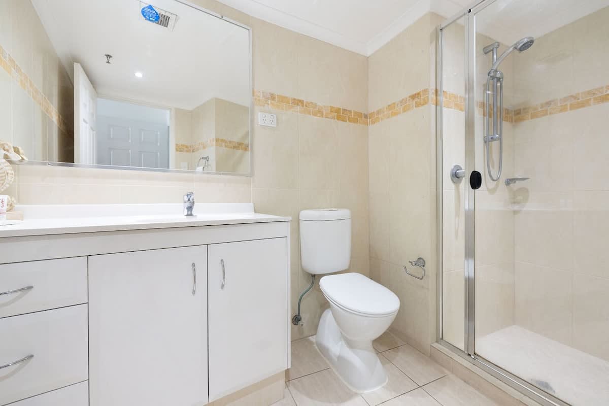Master bedroom 1 x Queen with ensuite bathroom with walk-in shower, toilet, basin, and hairdryer