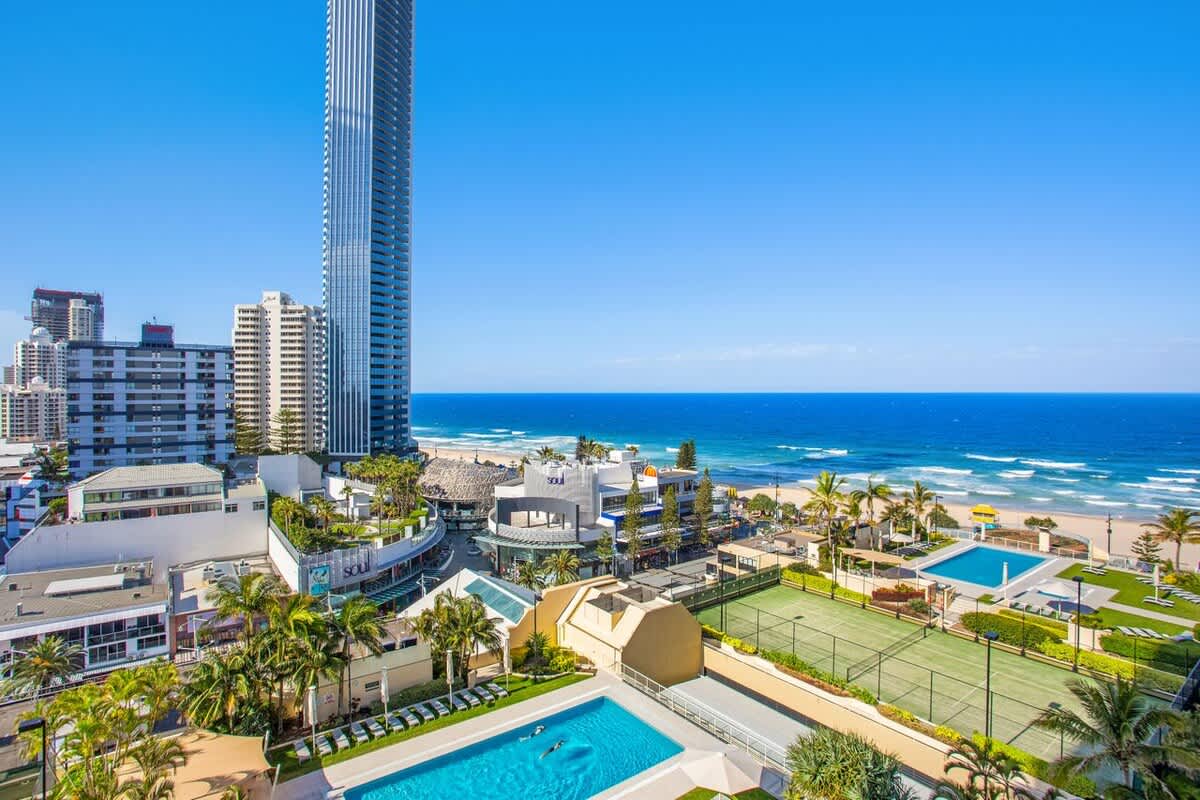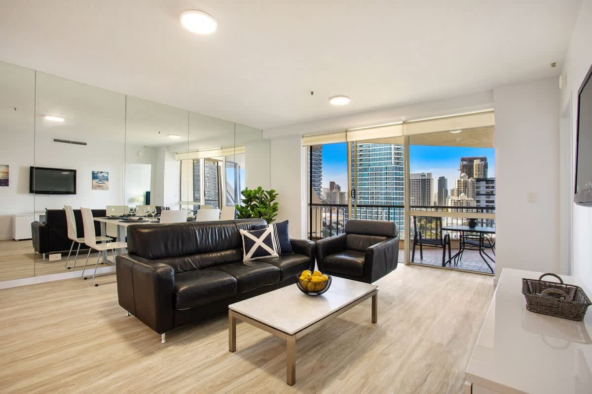 Smart TV with free foxtel in the lounge, which opens onto a sunny balcony with ocean, resort and city skyline views, including outdoor furniture.