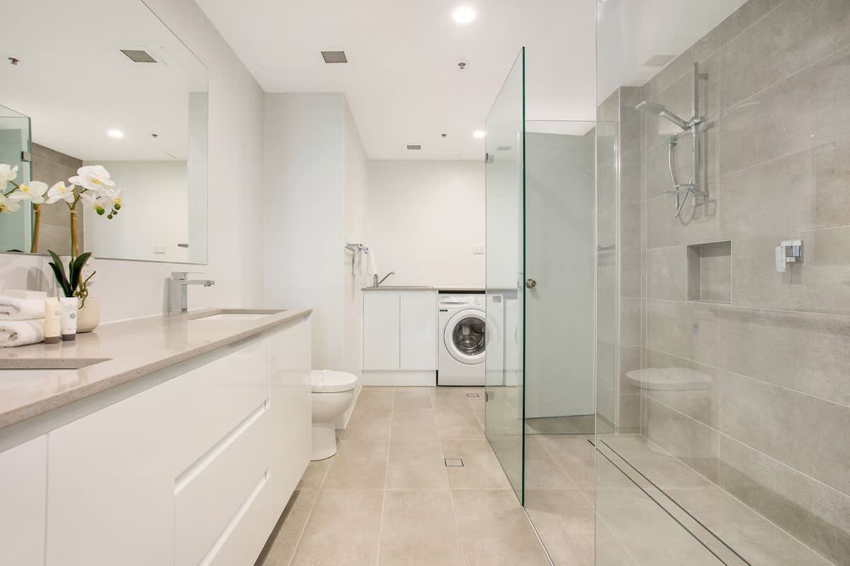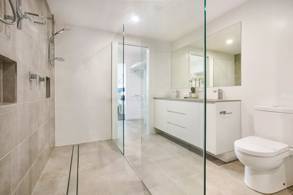 Master bedroom with a king size bed and large walk in robe which extends into a modern bathroom fitted with a walk in his and hers shower plus the dual sinks and full laundry facilities.