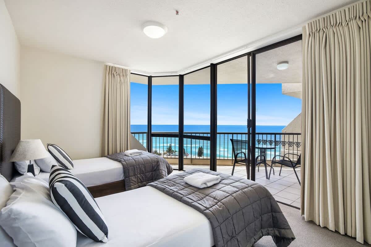 Second bedroom accommodates guests on two single beds which also has ocean views.