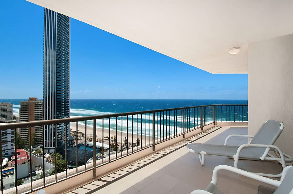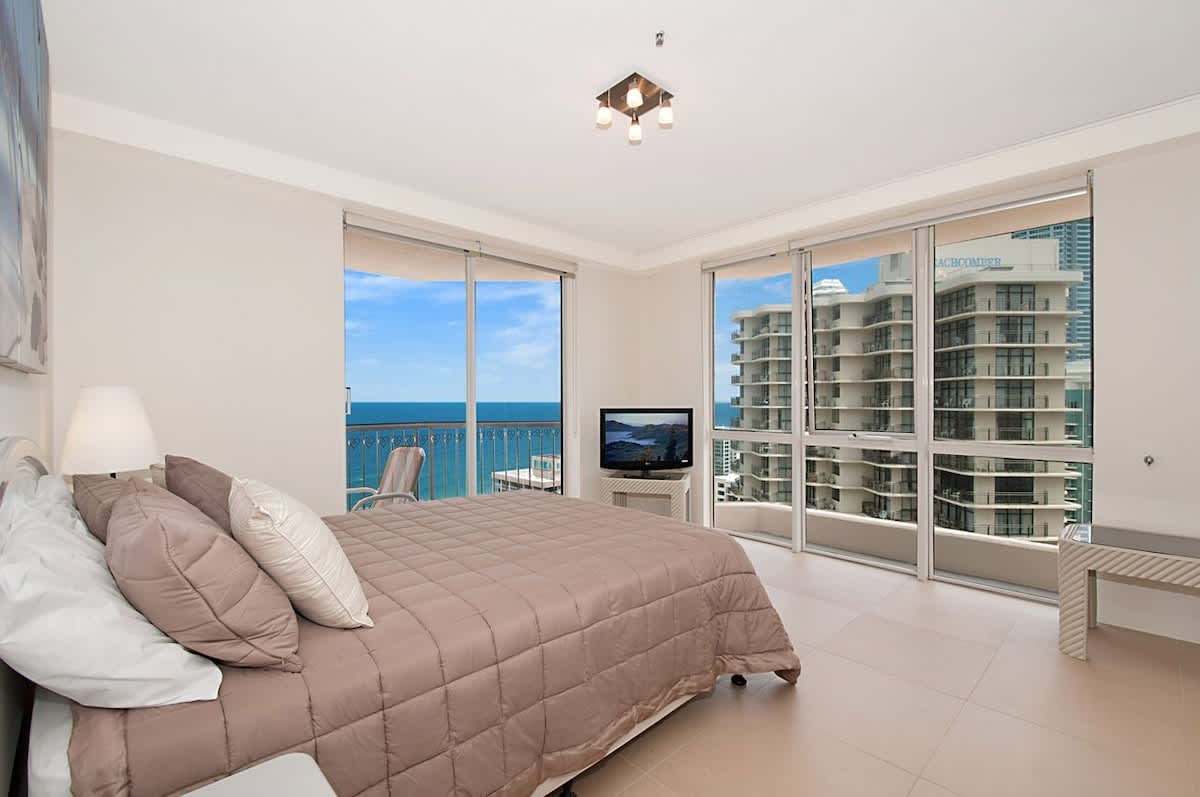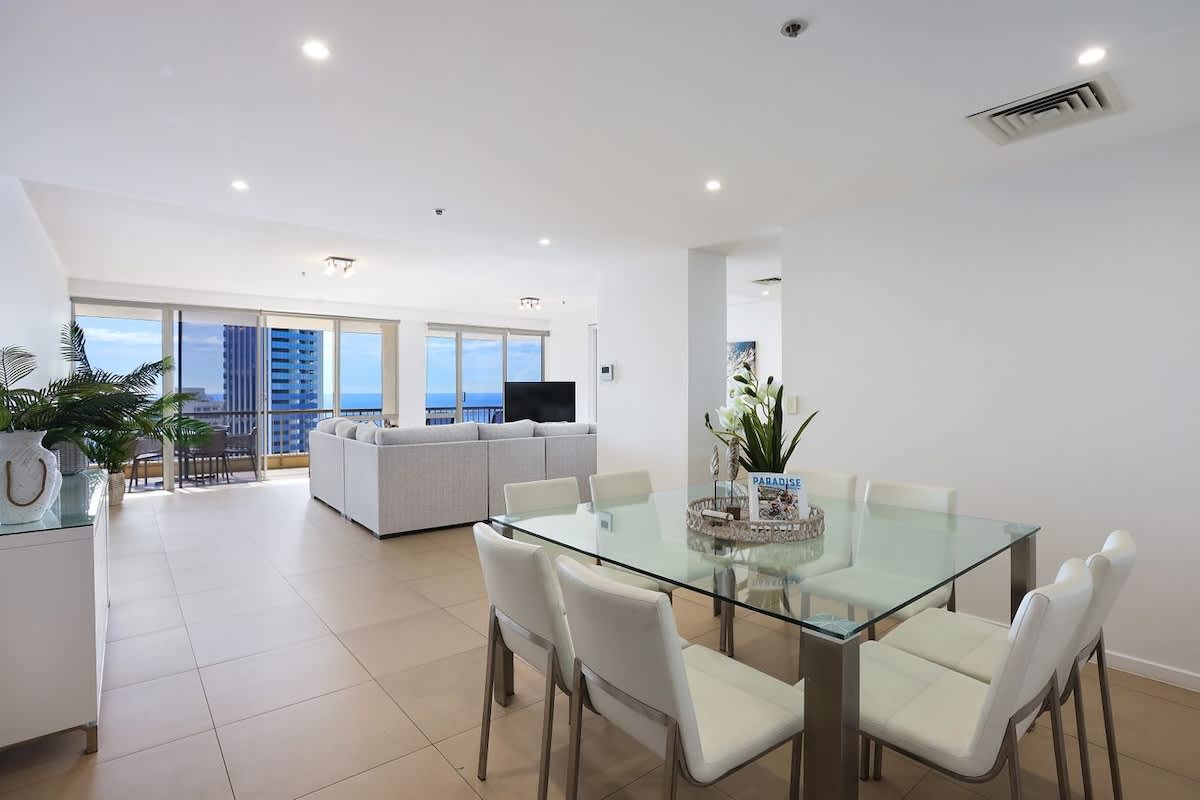 This magnificent three-bedroom Surfers Paradise apartment is located on the 26th level of Ballah Paradise Centre Apartments and commands sweeping views from the Hinterland, Nerang River, Surfers Paradise Beach and south to Coolangatta. Enjoy breathtaking views of the beach and the Pacific Ocean from the comforts of your Surfers Paradise accommodation!