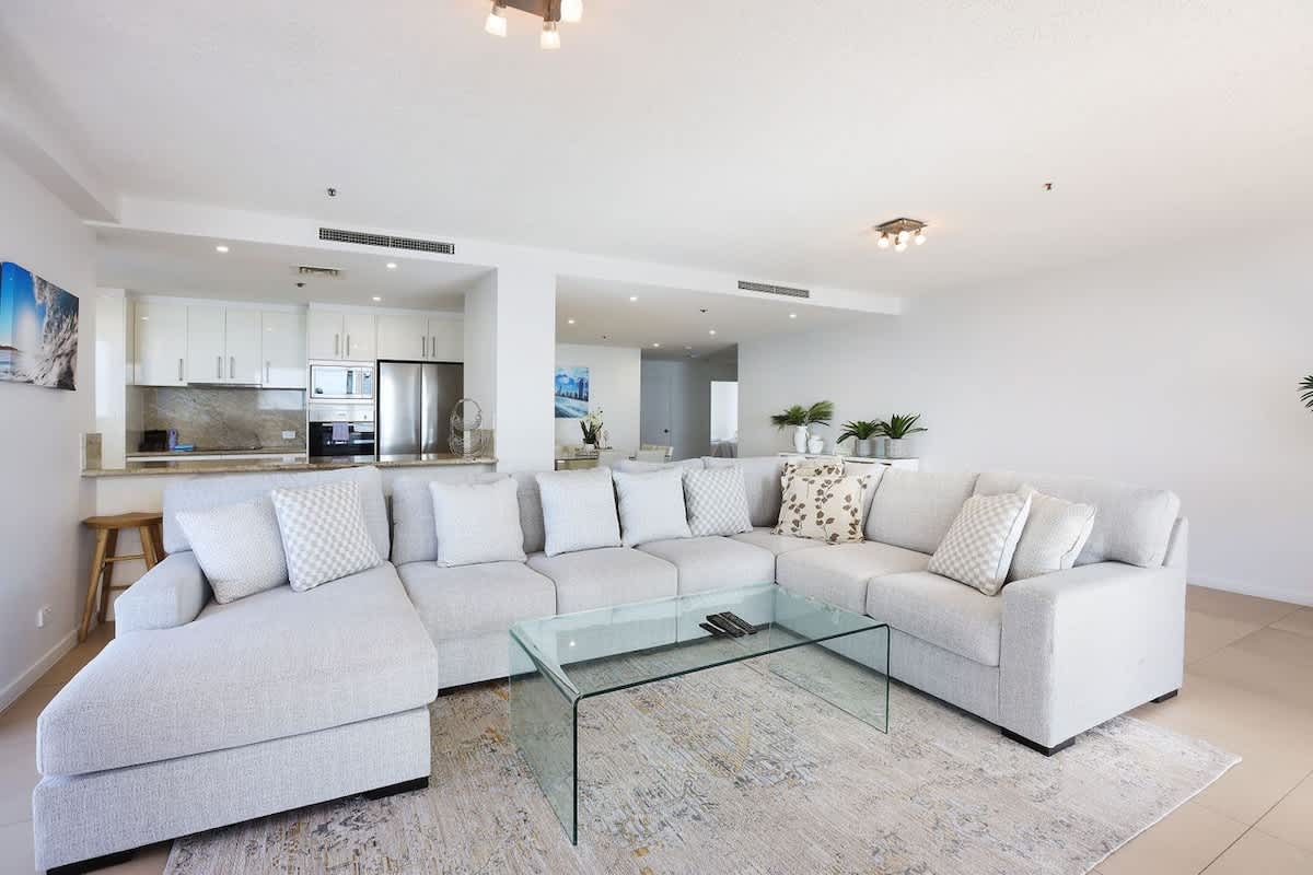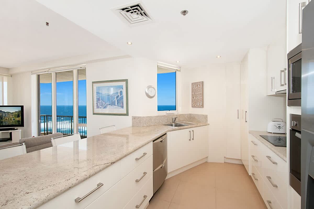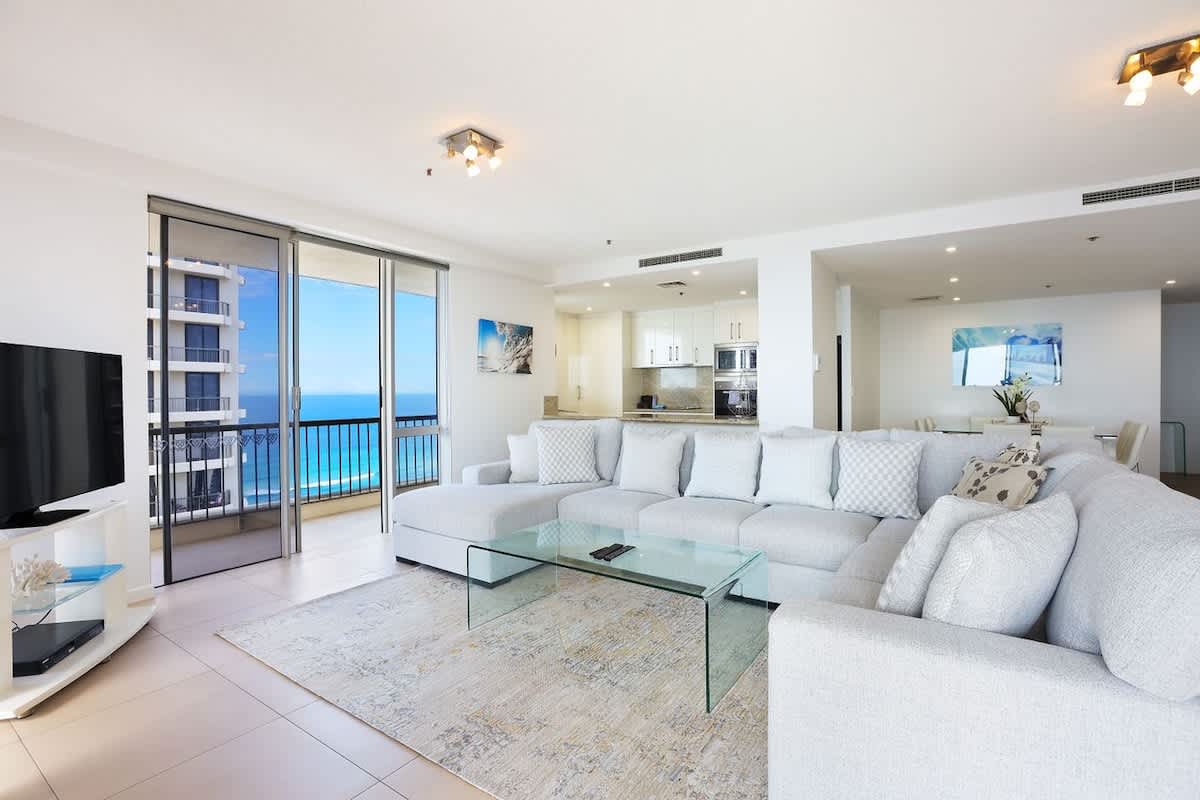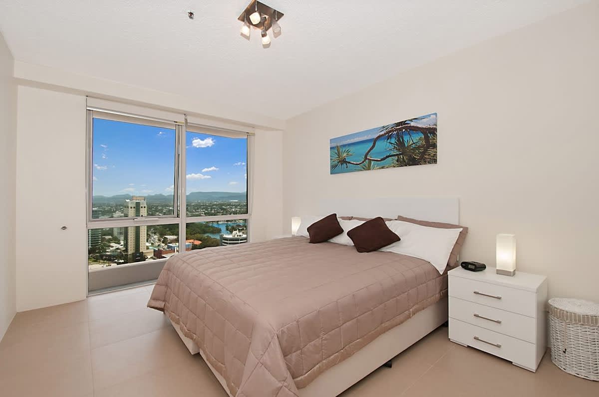 This magnificent three-bedroom Surfers Paradise apartment is located on the 26th level of Ballah Paradise Centre Apartments and commands sweeping views from the Hinterland, Nerang River, Surfers Paradise Beach and south to Coolangatta. Enjoy breathtaking views of the beach and the Pacific Ocean from the comforts of your Surfers Paradise accommodation!