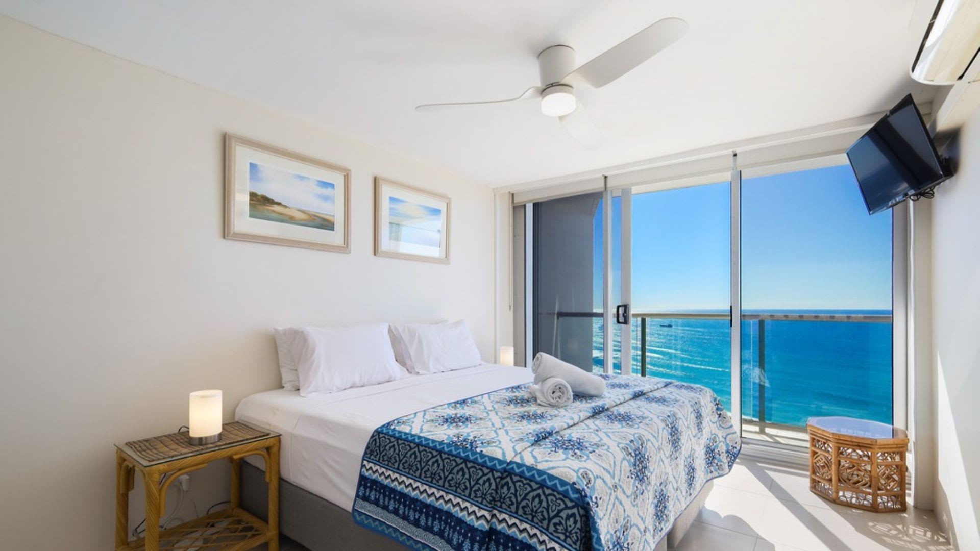 Bedroom 1: King Bed, En-Suite, Television, Air Conditioning, Walk-In Robe, Balcony Access, Private Balcony.