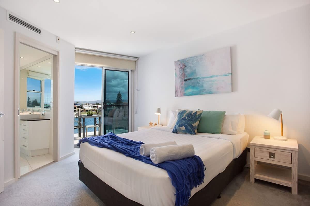 - Bedroom 1 (master 1): queen bed, ensuite bathroom, ducted air conditioning, TV, river views, private balcony.