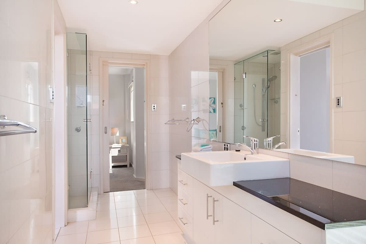 Keen chefs are sure to envy this contemporary black and white kitchen with its gleaming black granite countertops and sleek white units. It's sure to be the hub of social chatter as you make plans for the day. Prepare breakfast, snacks and drinks for the family while enjoying those superb river views through the open doors. Before heading out for the evening, share tasty hors d'oeuvres and a glass of chardonnay over the breakfast bar sitting on elegant high stools.